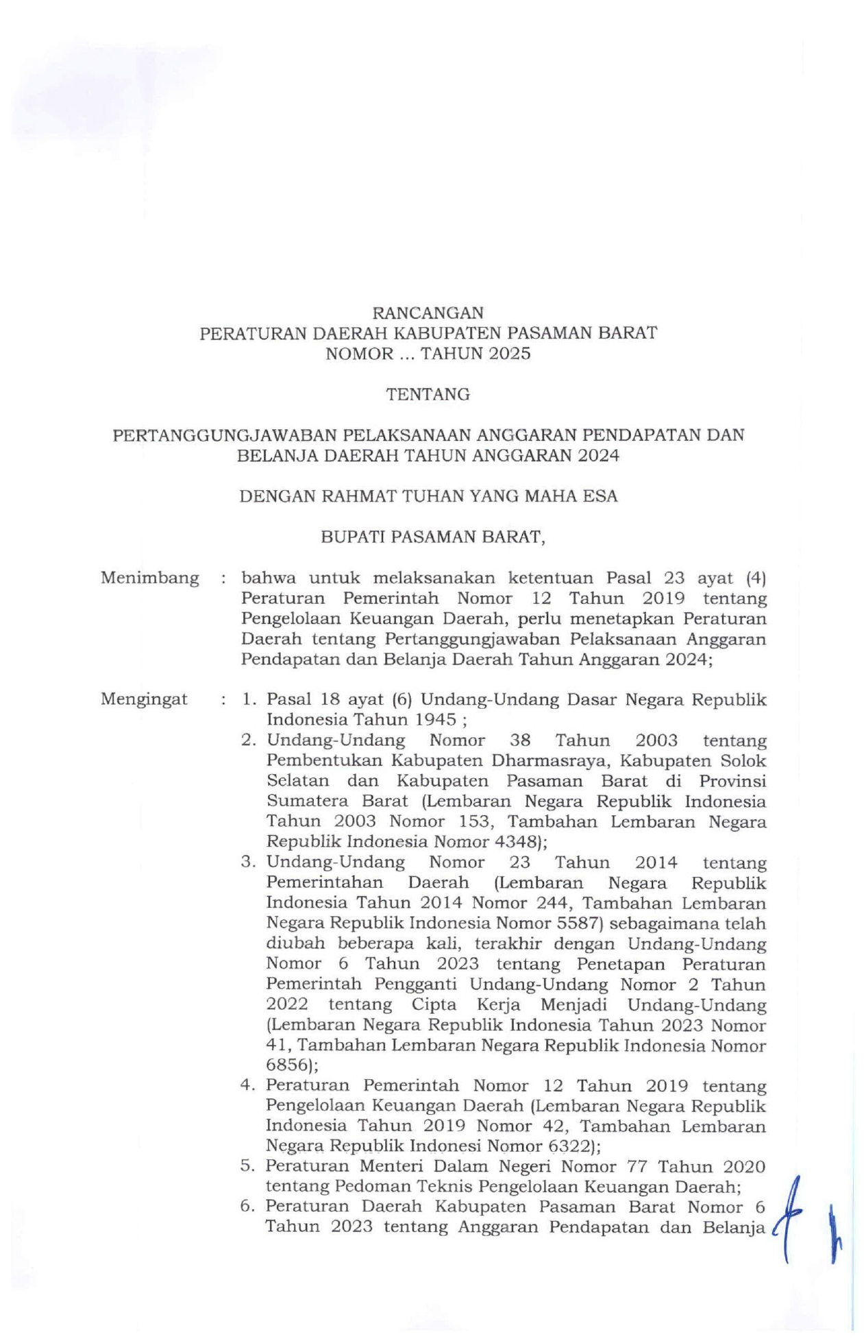 Rancangan Peraturan Daerah Kabupaten Pasaman Barat Tentang Pertanggungjawaban Pelaksanaan Anggaran Pendapatan dan Belanja Daerah Tahun Anggaran 2024 -