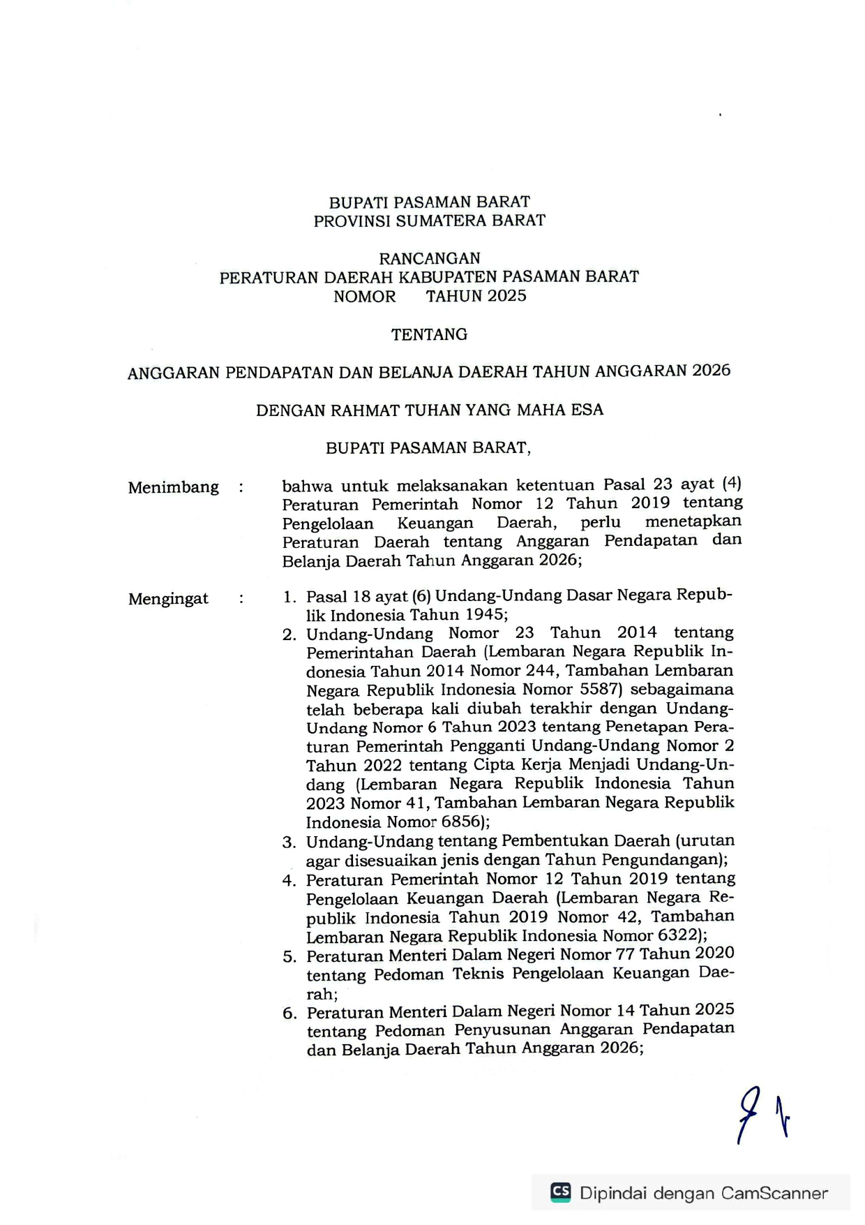 Rancangan Peraturan Daerah Kabupaten Pasaman Barat tentang Anggaran Pendapatan Dan Belanja Daerah Tahun Anggaran 2026 -