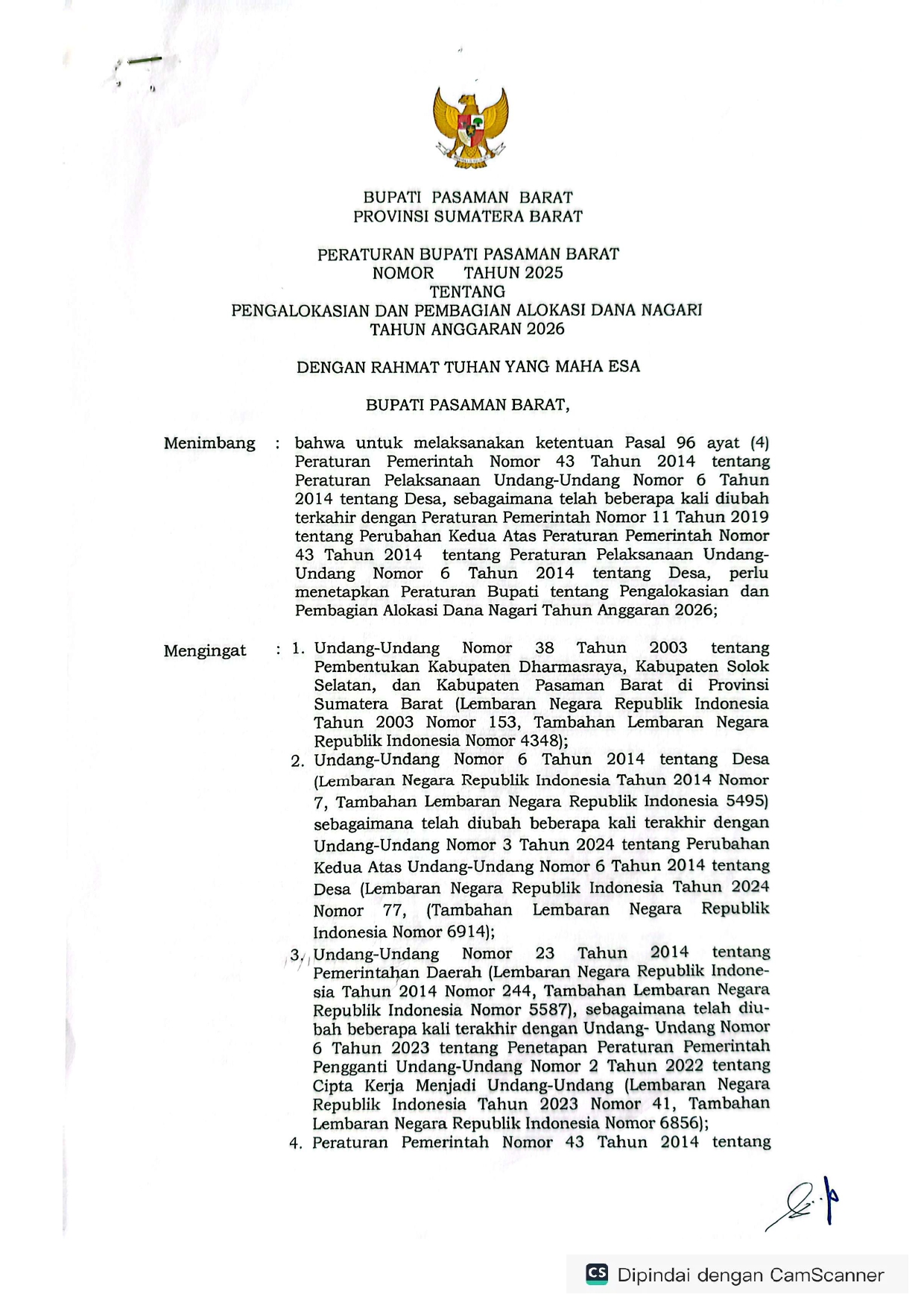 Rancangan Peraturan Bupati Pasaman Barat Tentang Pengalokasian dan Pembagian Alokasi Dana Nagari Tahun Anggaran 2026 -