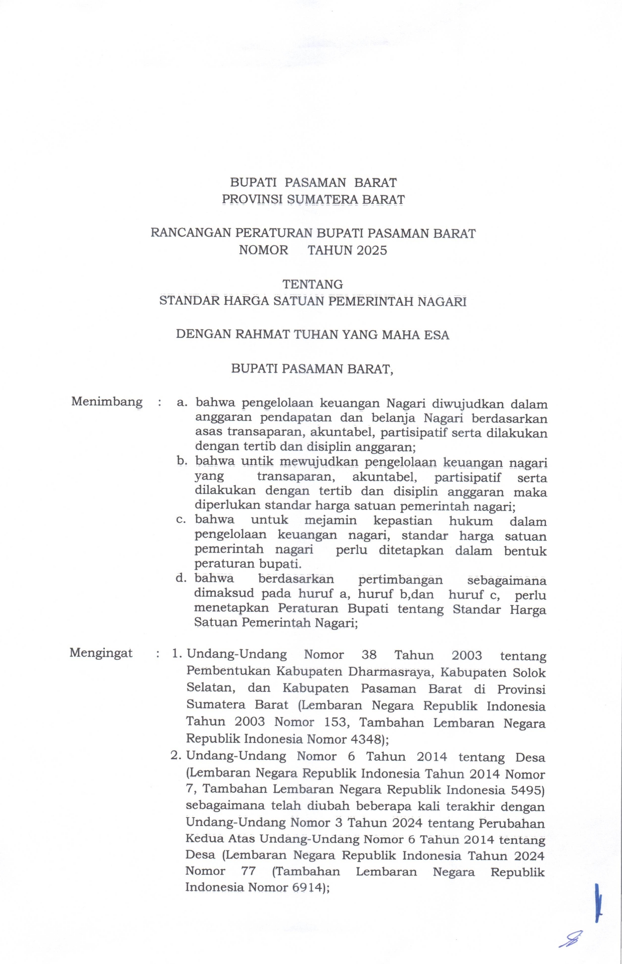 Rancangan Peraturan Bupati Pasaman Barat Tentang Standar Harga Satuan Pemerintah Nagari -