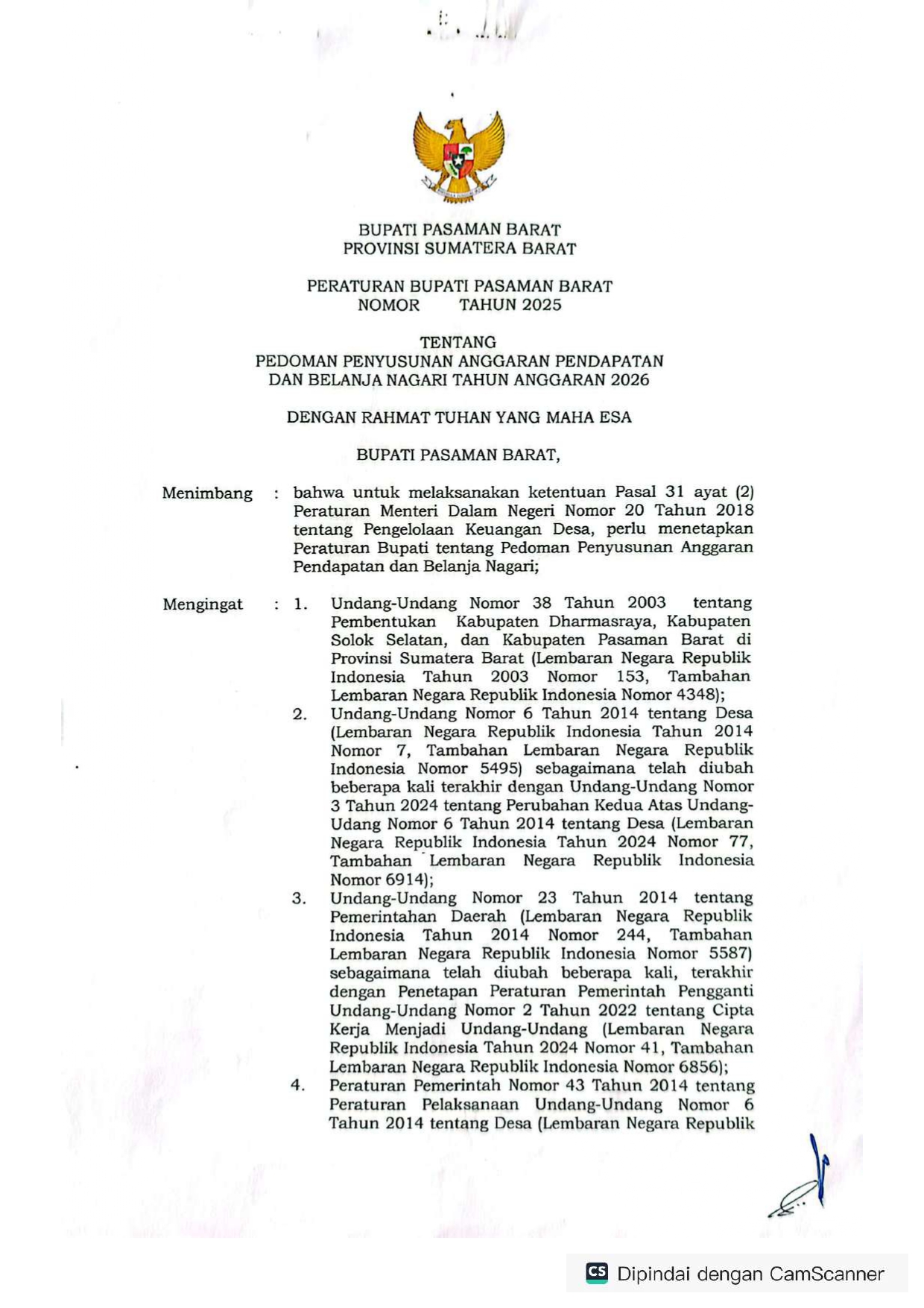 Rancangan Peraturan Bupati Pasaman Barat Tentang Pedoman Penyusunan Anggaran Pendapatan dan Belanja Nagari Tahun Anggaran 2026 -