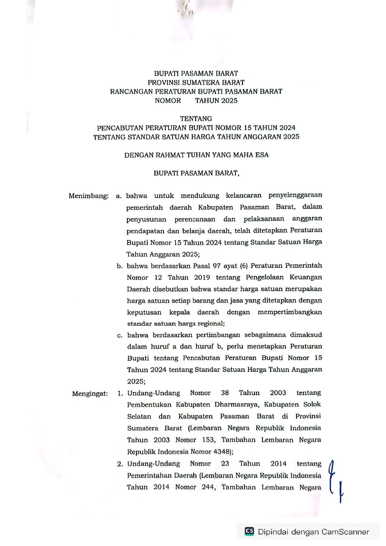 Rancangan Peraturan Bupati Pasaman Barat Tentang Pencabutan Peraturan Bupati Nomor 15 Tahun 2024 Tentang Standar Satuan Harga Tahun Anggaran 2025 -