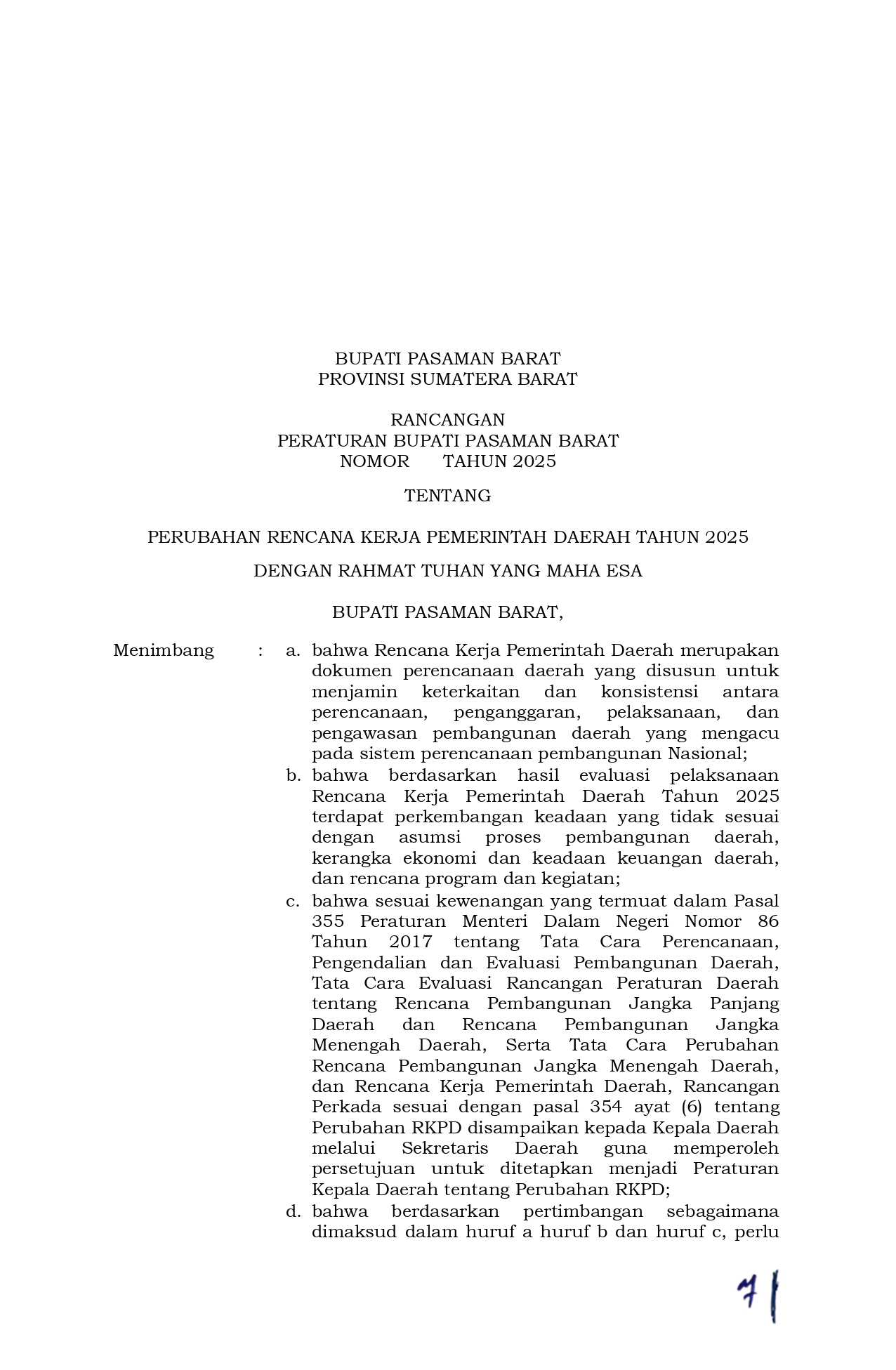 Rancangan Peraturan Bupati Pasaman Barat Tentang Perubahan Rencana Kerja Pemerintah Daerah Tahun 2025 -