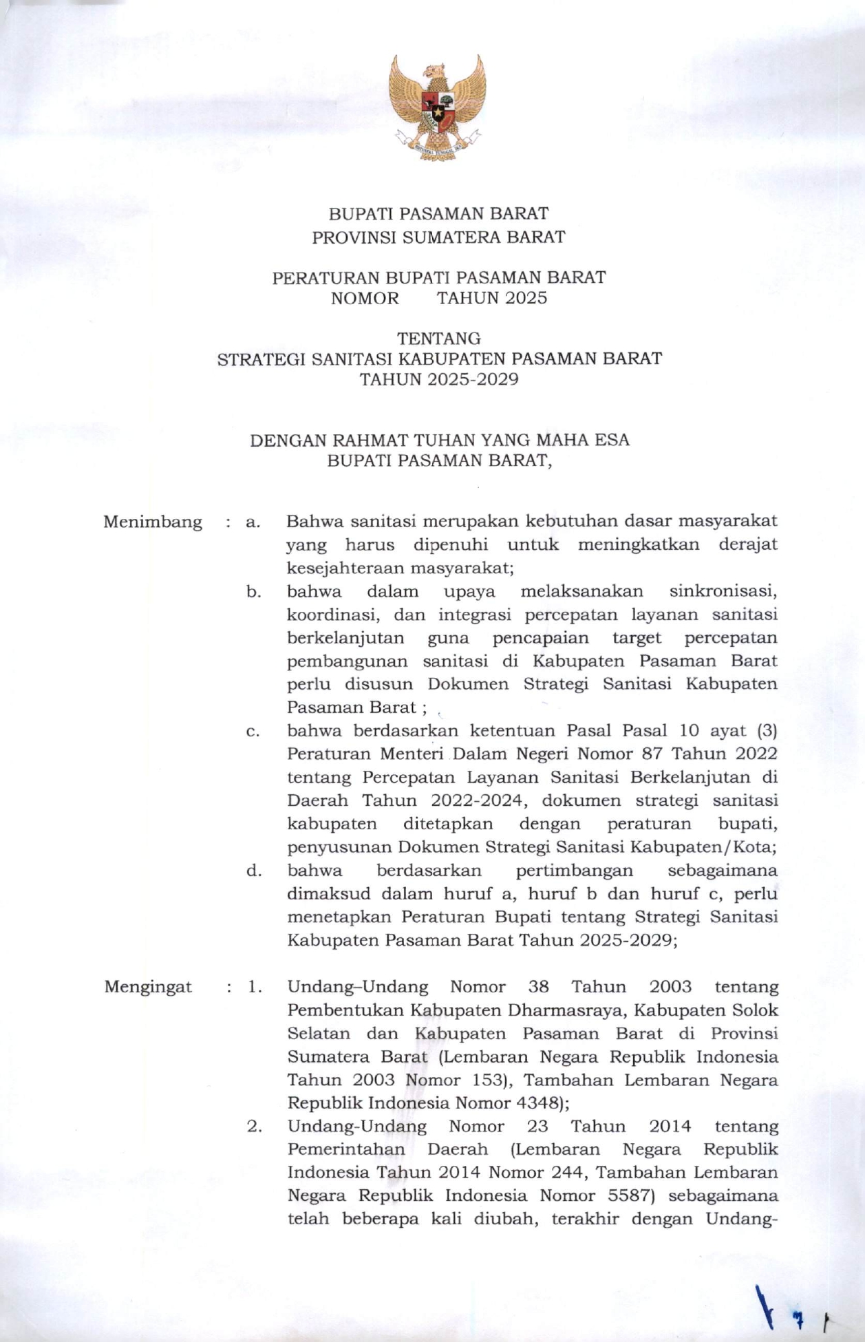 Rancangan Peraturan Bupati Tentang Strategi Sanitasi Kabupaten Pasaman Barat Tahun 2025-2029 -